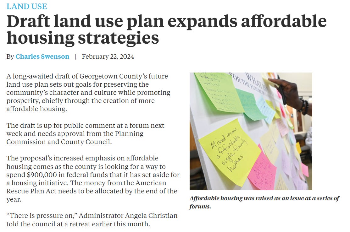 The Land Use Element of the Georgetown County Comprehensive Plan is online and your input is needed to make this plan a good plan for our future.